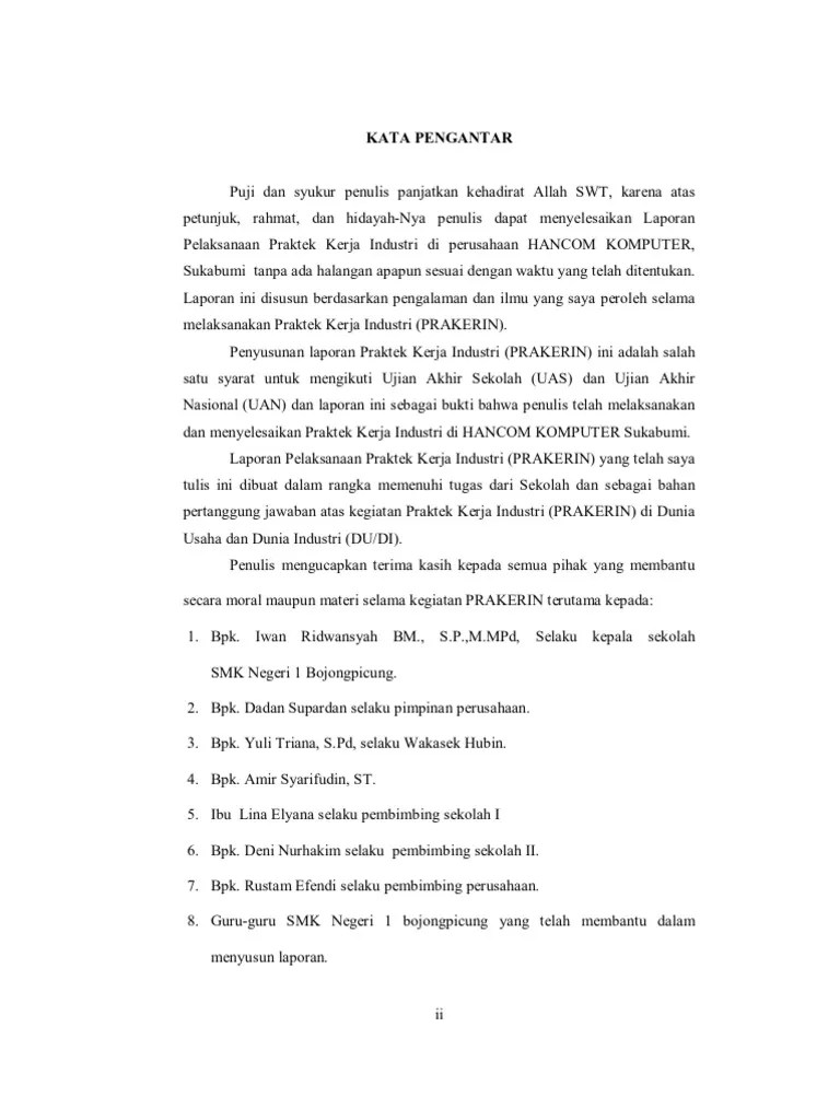 Laporan ini diajukan sebagai salah satu syarat untuk mengikuti ujian akhir nasional. Apabila kamu berasal dari jurusan . Contoh laporan pkl smk jurusan akuntansi. Contoh laporan prakerin/pkl/magang/ppl/observasi/penelitian jurusan administrasi perkantoran, tkj, otomotif, pemasaran, multimedia, . Laporan praktek kerja industri (prakerin) di bengkel.